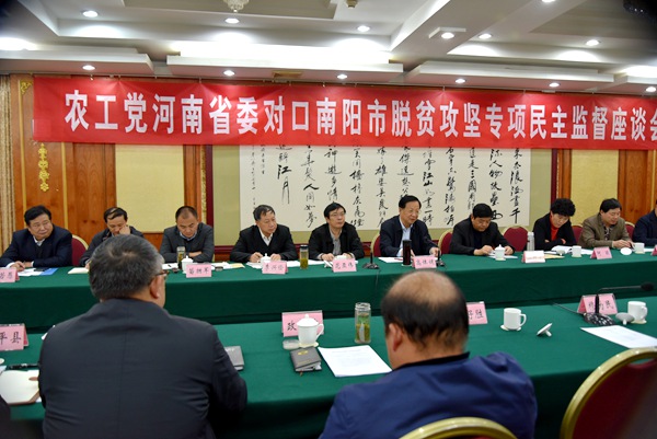 在随后召开的农工党河南省委会对口南阳市脱贫攻坚专项民主监督座谈会上,中共南阳市委书记穆为民致辞并表示要把脱贫攻坚作为第一民生工程来抓,坚持以脱贫攻坚统揽经济社会发展全局,全力配合与支持农工党河南省委会对南阳脱贫攻坚进行民主监督。南阳市市长霍好胜就南阳市脱贫攻坚工作进展情况作了全面介绍,中共南召、镇平县委书记分别详细介绍了当地脱贫攻坚工作情况,市扶贫办、卫生计生委、民政局、林业局、财政局等单位分别发言。调研组成员围绕脱贫攻坚中的实际问题进行了沟通交流,提出了解决因病致贫、因学致贫、因残障致贫、社会保障兜底、引导在外经商成功人士结对帮扶等针对性的对策建议。
