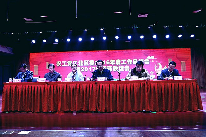 2016年12月10日,农工党江北区委会2016年度工作总结大会在江北区文化艺术中心8楼多功能厅举行。来自全区基层组织150余名党员参加大会。农工党重庆市委会主委杜黎明、副主委梅霞、江北区人大常委会副主任毛福群、农工党重庆市委会社会服务处处长罗华、中共江北区委统战部副部长闪定山,以及对口联系单位区卫计委党委书记、主任文泽力、区科委副主任张剑、区交委纪工委书记段礼全等出席。