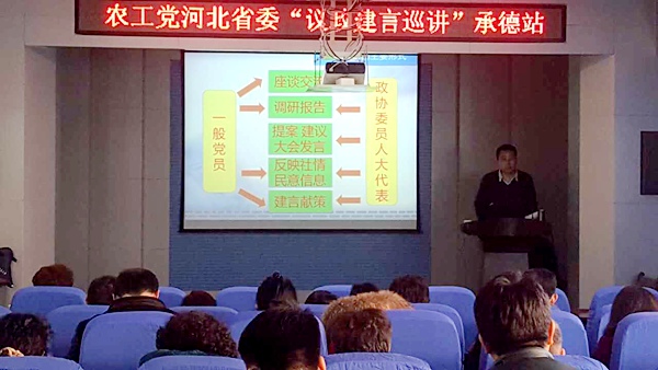 2017年2月23日上午,农工党河北省委会“议政建言巡讲”活动走进承德。农工党承德市委会名誉主委雷威、驻会副主委谷雪芬、副主委姜皑峰参加活动。