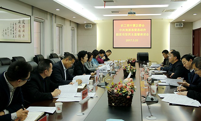 2017年3月23日,农工党宁夏区委会戴秀英主委按照中共宁夏自治区党委统战部的《关于支持各民主党派区委会开展脱贫攻坚民主监督工作的实施方案》的要求,就对口宁夏贫困山区海原县的民主监督工作,与海原县领导班子召开了座谈会,参加会议的还有区委会处级以上领导干部和农工党著名企业家。共同协商民主监督的六个方面(贫困人口精准识别情况、精准脱贫情况、贫困县摘帽及巩固情况、落实脱贫攻坚责任制情况、重大政策措施执行情况、扶贫资金项目管理使用情况)的重点任务。要求以开展调研,提出意见建议,参与专项监督评估,注重日常联系,进行政策宣讲为工作形式,开展脱贫攻坚民主监督工作。