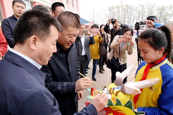 刘长青、韩占路为风筝龙头点睛。在老师们的精心组织下,双丰中心小学校300名学生进行了风筝放飞表演。