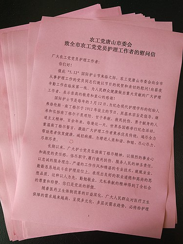 在5.12护士节到来之际,农工党唐山市委会发出慰问信,向辛勤工作在护理岗位第一线、为维护人民群众健康无私奉献的护士党员致以节日的祝贺和亲切的慰问。