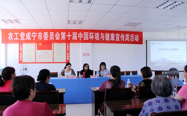 2017年6月7日下午,农工党咸宁市委会组织党员在咸安区永安办事处车站路社区承办了第十届中国环境与健康宣传周活动,通过开展“空气质量与健康”知识讲座及空气质量检测、医疗健康服务咨询及送医送药活动及环保知识宣传等三大主题活动落实了农工党中央实施“宣传周”活动“空气质量与健康”的主题。农工党咸宁市委会专职副主委余艳萍参加活动。