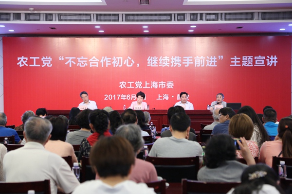 2017年6月7日下午,农工党上海市委会和静安区委会在静安区海上文化中心五楼多功能厅联合举办“前进讲坛”暨农工党“不忘合作初心,继续携手前进”主题宣讲报告会。农工党上海市委会专职副主委陈芳源出席并讲话。农工党上海市委会常委,复旦大学教授、上海浦东新区卫生发展研究院院长梁鸿作了题为《构建具有中国特色的健康之路》的宣讲报告。农工党上海市委会副主委、静安区委会主委叶强主持报告会。
