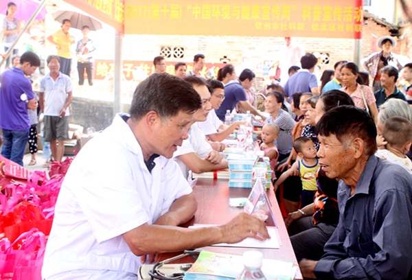 结合今年中国环境与健康宣传周的主题“空气质量与健康”,启动仪式后,来自广西区人民医院和自治区江滨医院以及钦州市多家医院的农工党医疗专家们为青塘镇的广大群众进行健康义诊咨询。当地群众一大早就排起长队,等待着在家门口接受知名专家的现场诊疗。专家们对前来诊疗的群众耐心询问、细心诊断,把脉开方,开展血压测量,发放活动资料。活动为近200名群众进行了义诊义检,开出药方近百份,发放药品价值2.6万元,宣传手册1000多份,为当地群众解决了实际困难,得到了群众的高度赞誉。