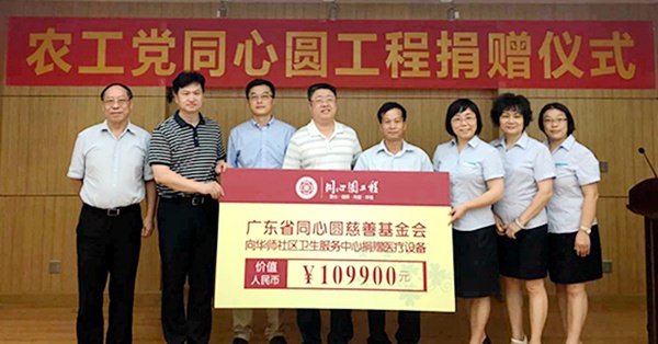 2017年6月23日下午,同心圆工程医疗设备捐赠仪式在华南师范大学社区卫生服务中心举行,广州市人大常委会副主任、农工党广州市委会主委余明永,华南师范大学党委副书记黄兆团,农工党广州市委会副主委江英桥,华南师范大学医院院长胡悒萍,同心圆慈善基金会执行会长赵刚,同心圆慈善基金会秘书长刘勇等出席捐赠仪式、并为同心圆工程第一次走进社区做了揭牌仪式。