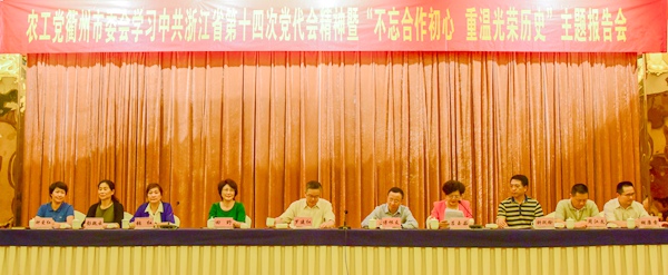 2017年6月23日下午,农工党衢州市委会在国际大酒店开展学习中国共产党浙江省第十四次代表大会精神暨“不忘合作初心,重温光荣历史”主题报告会。省委会主委罗建红应邀出席并作《巩固合作共识,携手砥砺前行》主题报告。中共衢州市委常委、统战部部长傅根友应邀出席并作省第十四次党代会辅导报告。省委会专职副主委田野出席会议。农工党衢州市委会主委吕玉茹主持活动。