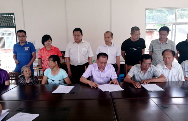 在飘零村村部和乐益村村部,周永尧与乡、村干部、百色沿海投资企业商会领导、挂村第一书记及特困户座谈,针对精准扶贫工作纵深发展过程中碰到的问题和困难,共商产业发展良策。周永尧还主持了百色沿海投资企业商会与飘零村、乐益村12户特困户的结对帮扶协议签订仪式。