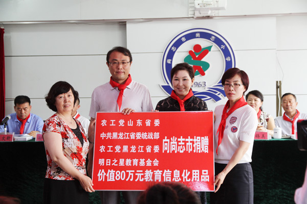 捐赠仪式在尚志市尚志小学举行。仪式上,农工党山东省委会、农工党黑龙江省委会、明日之星教育基金会向尚志市2个实验班和40所中小学捐赠价值80万元的平板电脑、学习软件、学习卡等班班通教辅物资。