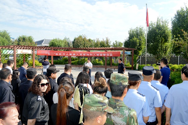 在水区众泰社区的广场上,社区居民、社区干部和市委统战系统的机关全体干部一起举行了庄严的升国旗仪式,重温入党誓词。随后,召开了组织生活会,乌鲁木齐市委统战部常务副部长窦建新为大家讲了党课。农工党乌鲁木齐市委会也发动党员开展感党恩、听党话、跟党走的活动。市委会副主委潘波在所在单位乌鲁木齐市第16中学参加了“感党恩 听党话 跟党走”纪念建党96周年党员党日活动,戴上党徽的那一刻,她说,我不仅是中共党员,也是农工党党员,在今后的工作中更要履行好自己的职责,在本职工作中尽职尽责、积极上进,在党派工作中不断学习,严守政治纪律,提高政治觉悟,努力提高自己的参政议政能力,为首府的社会稳定和长治久安贡献自己的力量。(农工党乌鲁木齐市委会)