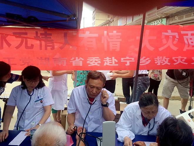 农工党湖南省委会坚决贯彻落实中共湖南省委的决策部署和杜家毫书记7月2日讲话精神,积极履行“关于全省民主党派组织和民主党派成员支持和投身抗洪救灾的倡议”,灾情发生后,涌现出一批优秀党员,自发通过各种途径、多样形式积极投入到了抗洪救灾之中,对灾区进行生活物资和药品方面的援助。7月9日,省委会组织由湘雅医院、湘雅附三、省人民医院、省胸科医院、长沙市一医院、长沙市四医院等支部医务工作者组成专家医疗队赴宁乡坝塘镇南田坪村开展救灾义诊,现场接诊群众190人次,发放洪涝灾害预防宣传资料500余份,结合灾区急需,以皮肤病和肠道传染病为重点,给村民进行卫生防疫知识讲解,指导村民进行环境消毒处置,现场有近300群众接受咨询。义诊结束后,专家们还到南田坪卫生院查房巡诊,为13位病人给出了治疗方案建议。在南田坪卫生院,农工党湖南省委还向南田坪卫生院、龙福新村卫生室捐赠了分别由泰阳医药发展有限公司(10.8765万元)、长沙三真医院(0.6万元)提供的共计11.4765万元的常用急需药品和卫生防疫消毒用品。