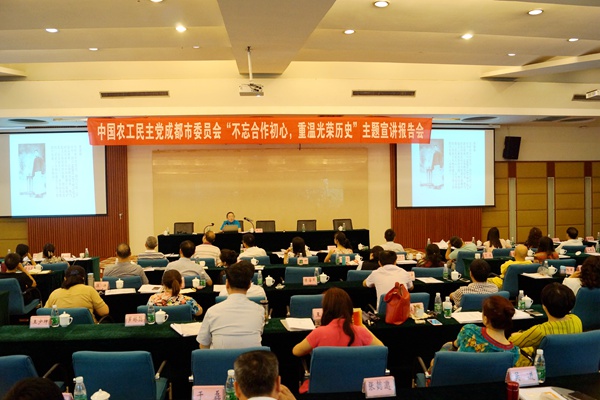 2017年7月6日,农工党成都市委会“不忘合作初心,重温光荣历史”主题宣讲报告会在成都市郫都区举行。市委会主委甘华田出席宣讲活动并讲话,副主委冯俭、池雷霆、胡伟峰,秘书长曾琪出席活动。