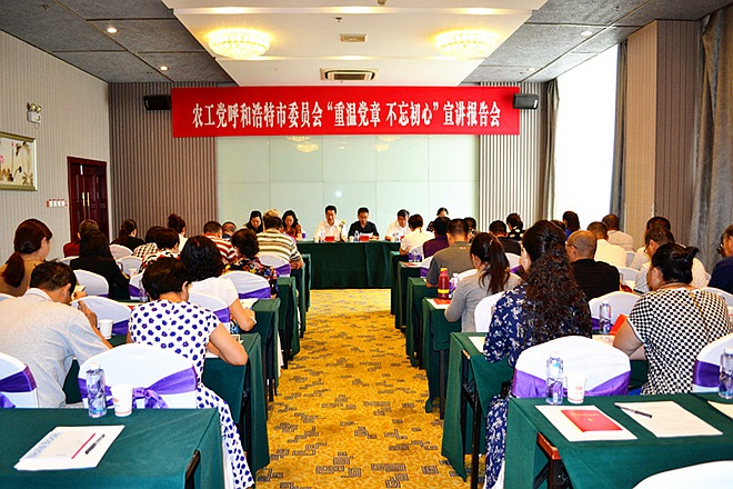 2017年7月27日上午,农工党呼和浩特市委会“重温党章 不忘初心”宣讲报告会在呼和浩特市举行。呼和浩特市人大常委会副主任、农工党呼和浩特市委会主委鲁剑钧出席报告会并讲话。农工党自治区委委员、办公室主任陈永胜,中共呼和浩特市委统战部党派处处长李晓红、副处长赵焰应邀出席报告会。农工党呼和浩特市委会副主委岱沁主持报告会。