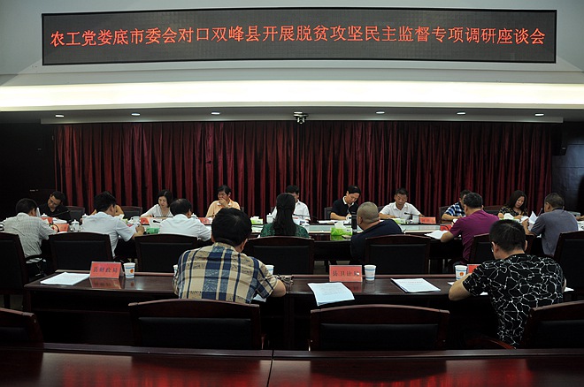 开展脱贫攻坚民主监督,是中共中央赋予民主党派的一项新任务,是党派发挥民主监督作用的有益尝试,也是民主党派协助中共地方党委和政府打赢脱贫攻坚战的重要形式。2017年8月7日,农工党娄底市委会对口双峰县脱贫攻坚民主监督专项调研座谈会在双峰县行政中心会议室召开,农工党娄底市委会主委、市卫生计生委副主任郭细军率党内相关专家、学者赴双峰调研,开展脱贫攻坚民主监督工作。中共市委统战部常务副部长王美成应邀出席会议并讲话。杨萍、阳雄绪、曹科识、杨斌等县领导及县财政局、卫计局、教育局、扶贫办相关负责人,甘棠、梓门、荷叶等乡镇主要负责人参加座谈会。