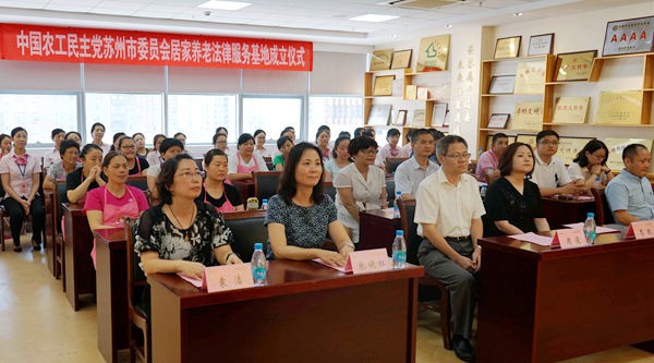 2017年8月24日下午,由农工党苏州市委会社会与法制工委主办、姑苏区工委协办的农工党苏州市委会居家养老法律服务基地和居家养老志愿者服务队成立仪式在苏州市姑苏区“居家乐”养老服务中心举行。苏州市政协副主席、农工党苏州市委会主委周俊,中共姑苏区委常委、保护区党工委委员、统战部部长季珉,农工党苏州市委会副主委兼秘书长张健红,吴中区司法局副局长、农工党苏州市委会社会与法制工委副主任王伟男,中共姑苏区委统战部业务处处长袁洁,姑苏区居家乐养老服务中心主任刘俊秋等领导出席仪式。活动由姑苏区政协副主席、农工党苏州市委会副主委、姑苏区工委主任曹源主持。