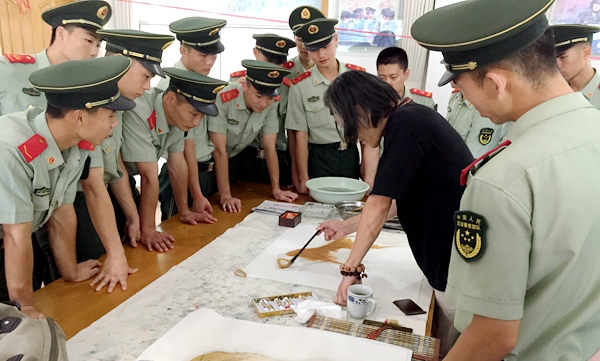 艺术家进军营的活动,受到官兵们的热烈欢迎。大家参观了部队历史和内务,感受军营文化,接受爱国主义教育。随后,艺术家们现场进行书画创作,他们一边创作,一边向围观的战士介绍中国的传统书画艺术,指导他们如何去鉴赏书画作品。短短的两个多小时时间,艺术家们即兴创作了十余幅精美的书画并捐赠给武警中队:有苍劲有力的行书、古意盎然的篆书等书法作品,也有描绘猛虎、骏马、自然山水的写意中国画。武警官兵们在观赏艺术家们创作的同时,也接受了一次中国传统文化的熏陶。