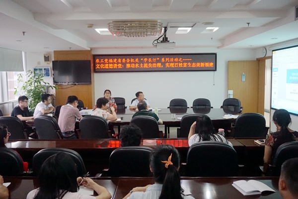 2017年9月4日下午,农工党福建省委会机关在同心楼十一层会议室举办文化道德讲堂,邀请全国人大代表、农工党福建省委会常委、省环科院副院长张玉珍博士为机关干部职工作题为“推动水土治理,实现百姓富生态美新福建”的专题讲座。讲座由农工党福建省委会专职副主委杨琳主持。