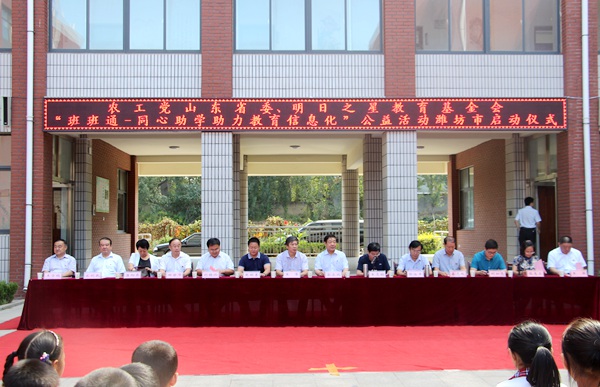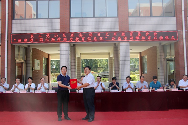 2017年9月20日上午,农工党山东省委会、明日之星教育基金会“班班通——同心助学助力教育信息化”公益活动捐赠仪式,在潍坊市临朐县龙山高新技术产业园龙岗小学举行。农工党山东省委会副主委王军,山东省工商联副主席、明日之星教育基金会名誉会长宗立成,明日之星教育基金会会长张明勇,潍坊市委统战部常务副部长王志明,潍坊市人大常委会副秘书长、农工党潍坊市委会主委刘棣俭参加了捐赠活动。