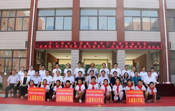 潍坊市委统战部、潍坊市教育局、临朐县相关领导、龙岗小学学生代表参加了捐赠活动。(农工党山东省委会)