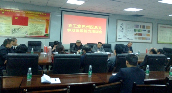 2015年12月1日下午,农工党巴州区总支在区人民医院七楼会议室举行参政议政培训会。会议邀请了巴州区政协副主席、区委统战部长唐廷奕,区政协教科文卫委主任杨会静为参会党员授课。总支主委李豫川主持培训会。