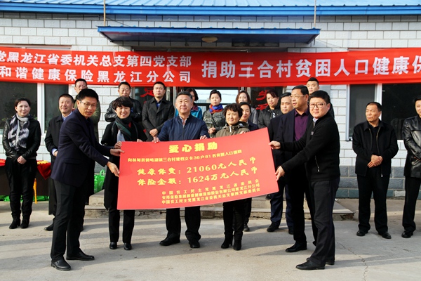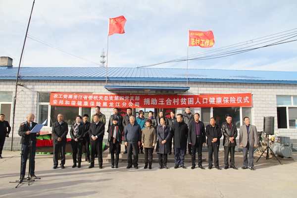 2017年10月9日下午,农工党黑龙江省委会机关总支第四支部、安邦保险集团和谐健康保险有限公司黑龙江分公司向林甸县鹤鸣湖镇三合村贫困人口捐助和谐健康保险仪式在三合村委会举行。