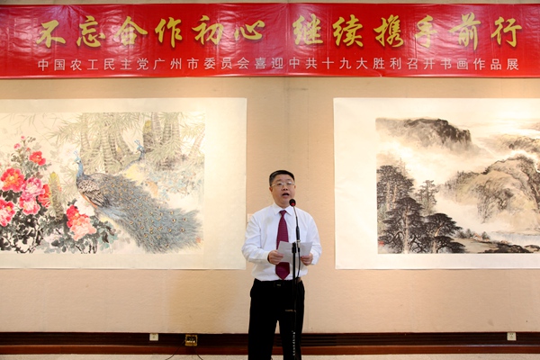 余明永指出,文化是民族凝聚力和创造力的重要源泉,值中共十九大胜利召开和农工党十六大即将召开之际,广州市委会友声书画院的书画艺术家们豪情满怀,精心创作了一批作品。他们运笔抒情,以书言志,以画寄情,用多彩的艺术形式,讴歌社会主义现代化建设的辉煌成就,讴歌民主党派与中国共产党患难与共、风雨同舟的光辉历程;表达了喜迎中共十九大胜利召开的喜悦心情,也表达了农工党广州市委会全体党员牢牢把握政治方向,始终在思想上政治上行动上同以习近平同志为核心的中共中央保持高度一致的坚定信念。