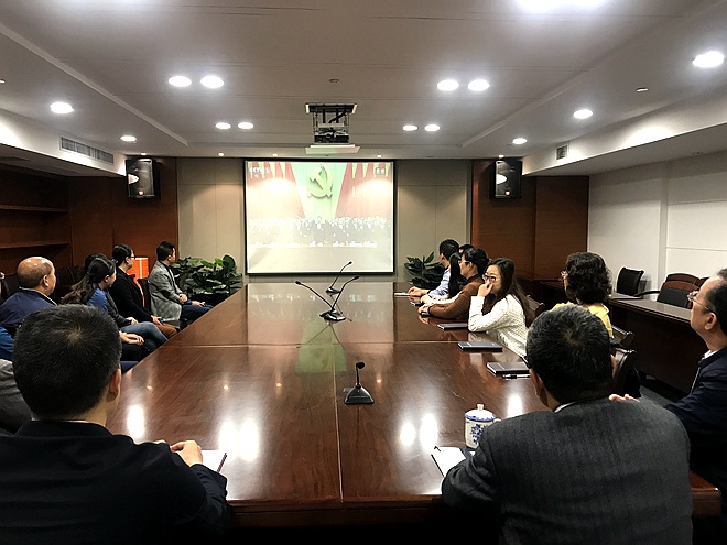 2017年10月18日上午,农工党江苏省委会领导班子部分成员和机关全体工作人员在机关会议室集中收看中共十九大开幕会盛况。农工党江苏省委会副主委、中国药科大学中药学院院长余伯阳,农工党江苏省委会副主委、南京邮电大学人文与社会科学学院院长、人口研究院院长沙勇,农工党江苏省委会秘书长王夫玉参加收看。