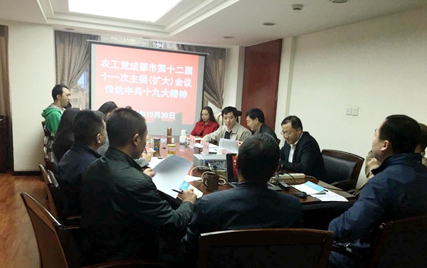 2017年10月30日,农工党成都市委会召开主委(扩大)会议,专题传达学习中共十九大精神。市委会主委甘华田出席会议并讲话,市委会副主委冯俭、胡伟峰,秘书长曾琪出席会议。