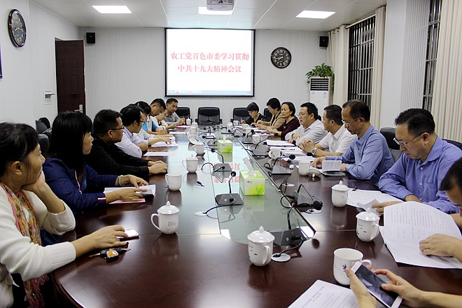 2017年10月27日晚,农工党百色市委会组织召开市委会扩大会议,学习贯彻中共十九大会议精神。农工党百色市委会主委周永尧出席会议并讲话。市委会委员,各支部主委、副主委共20余人参会。