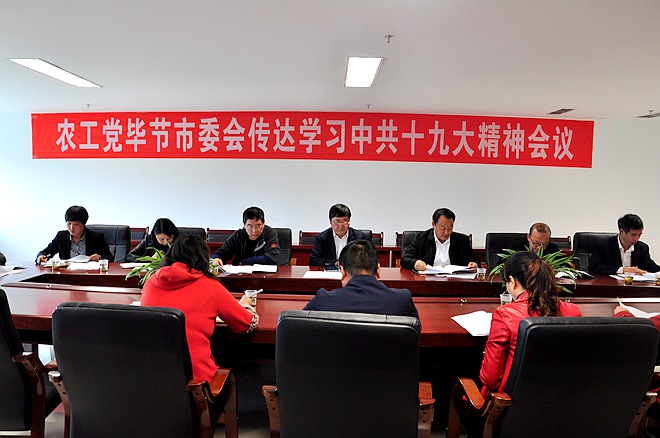 2017年10月27日下午,农工党毕节市委会在同心大厦三楼会议室召开二届四次全委(扩大)会议传达学习中共十九大精神,毕节市政协副主席,农工党毕节市委主委辜康乐主持会议并讲话。副主委庞小林,专职副主委刘发志出席会议。农工党毕节市委会委员、支部主委20余人参加会议。