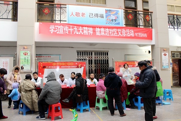 活动现场,社区门口摆放了学习中共十九大精神图解、居民健康教育处方等宣传展板,在社区活动中心,来自心内科、骨科、眼科、妇产科、儿科、泌尿科、外科等科室的十一位医疗专家,为社区的居民的免费提供量血压、测血糖等医疗服务,解答居民们健康咨询,宣传并发放疾病预防、健康保健知识材料。
