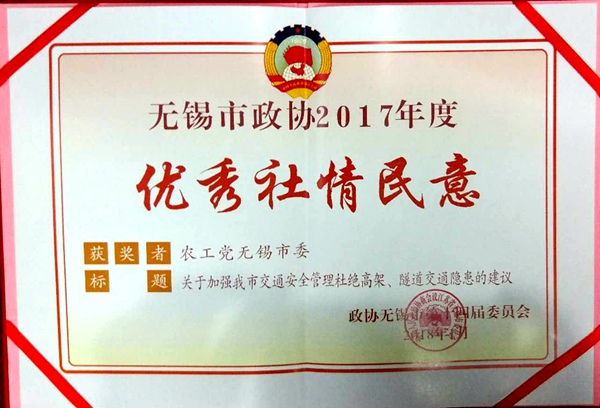 2017年12月29日,无锡市政协对年度社情民意信息工作进行了评比表彰,农工党无锡市委会报送的两篇信息获评“市政协优秀社情民意”:《关于调整涉及社区卫生服务机构医保政策的相关建议》(张亚菁)、《关于加强我市交通安全管理杜绝高架隧道安全隐患的建议》(钱娴)。