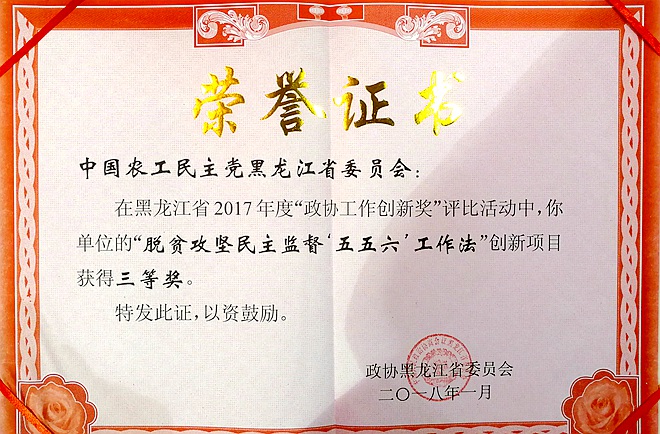 农工党黑龙江省委会的“脱贫攻坚民主监督‘五五六’工作法”获黑龙江省2017年度“政协工作创新三等奖”。