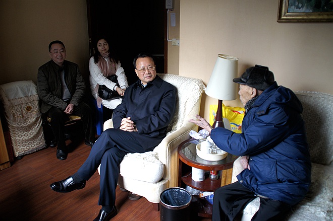 杜黎明迈步走进由酒店改建的老年公寓,来到 4楼一处两室的居所,与在房门口迎接的李伯村同志和夫人握手致意,并代表市委向李老献上一捧鲜花、节日慰问金和物品。
