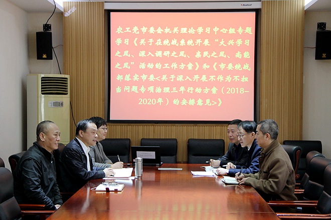 2018年4月8日下午,农工党天津市委会机关理论学习中心组专题学习《关于在统战系统开展“大兴学习之风、深入调研之风、亲民之风、尚能之风”活动的工作方案》和《市委统战部落实<关于深入开展不作为不担当问题专项治理三年行动方案(2018-2020年)>的安排意见》两个文件精神和统战部领导讲话精神。市委会专职副主委兼秘书长王毅斋主持会议并讲话。