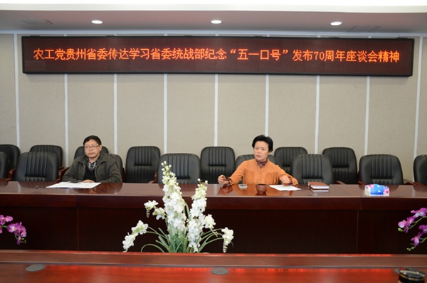 省委会介绍了4月27日贵州省统一战线纪念“五一口号”发布70周年座谈会的有关情况,传达学习了中共贵州省委书记、省人大常委会主任孙志刚所作批示精神,传达学习了贵州省政协主席、省委统战部部长刘晓凯讲话及农工党贵州省委会主委张光奇在会上发言的精神。