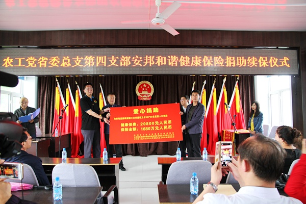 2018年6月27日上午,农工党黑龙江省委会机关总支第四支部、安邦保险集团和谐健康保险有限公司黑龙江分公司向林甸县鹤鸣湖镇三合村贫困人口捐助安邦和谐健康保险续保仪式在林甸县鹤鸣湖镇政府会议室举行。