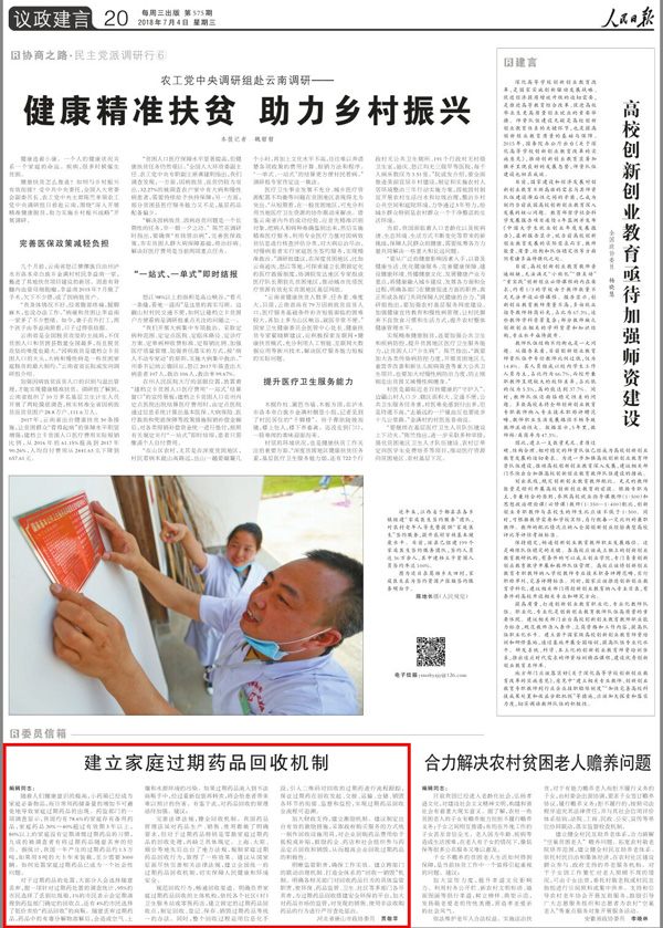 由农工党唐山市委会专职副主委贾敬苹撰写的社情民意信息《建立家庭过期药品回收机制》,刊发在7月4日《人民日报》的“议政与建言”专版,这也是农工党唐山市委社情民意稿件首次在《人民日报》刊发。