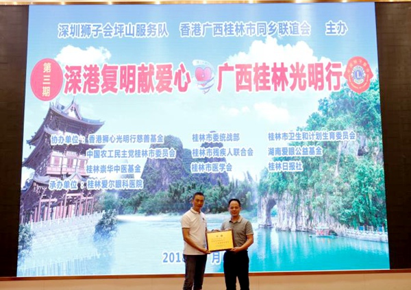 2018年7月29日上午,由深圳狮子会坪山服务队、香港广西桂林市同乡联谊会主办,中共桂林市委统战部、农工党桂林市委会等九家单位协办的“善行桂林·爱心复明”常见眼病大型公益巡讲暨“深港献爱心·桂林光明行”第三期启动仪式在桂林市隆重举行。