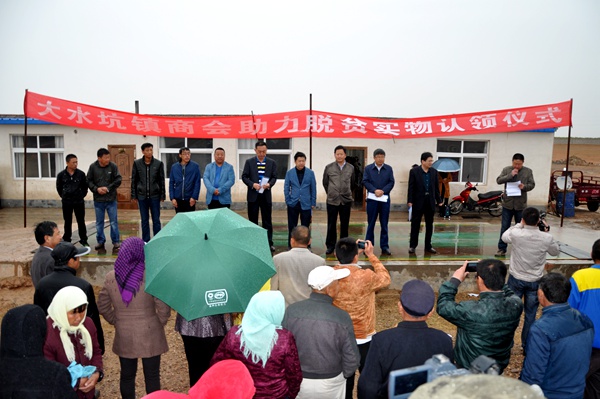 2016年5月16日上午,农工党吴忠市盐池县党小组联合大水坑商会在盐池县大水坑镇新泉井村举行助力脱贫攻坚帮扶发放仪式。