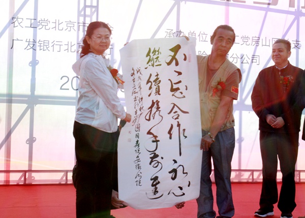 开幕式上,中国国画院安徽分院院长文士宾将以《不忘合作初心继续携手前进》为题的书法作品赠予北京市委会。