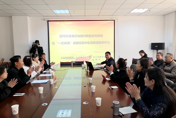 在“三学一讲”专题教育活动中,张周平以《坚持新型政党制度 奋力推进“一优两高”》为题,给与会党员讲了党课。他从历史角度深刻阐述了新型政党制度“三个新”,用事例对比方法说明了新型政党制度的优越性。在讲授学习新时代经济思想和生态文明思想,担负起“一优两高”新青海建设重任内容时,以“柴达木循环经济试验区”为例,列举了近年来农工党在全省经济建设中做出的突出贡献。在参政党建设方面,他提出党员要牢固树立政治意识、大局意识、核心意识、看齐意识,要坚持道路自信、理论自信、制度自信和文化自信,并对四个自信的涵义进行了详实诠释。他要求各级农工党组织要协调当地中共党委、统战部门,强化支委会的领导能力,引导支委和党员争做忠诚、干净、担当、履职的模范,不断提高基层组织的凝聚力,围绕“一优两高”战略做出贡献。