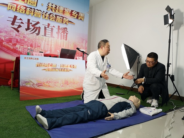 时值中国共产党成立100周年之际,农工党重庆市黔江区支委会为积极响应农工党重庆市委会“共绘同心圆·共建家乡美”社会服务品牌建设,于2021年3月26日晚19:00,首场直播在“黔江在线”直播间启动。直播现场,农工党党员、重庆市黔江区中心医院陈麒麟主任通过理论讲解与现场实操相结合,生动形象地为线上观众讲解心肺复苏、AED使用方法等急救知识,现场互动热烈,观看直播群众超3万人次,掀起了全民学急救的热潮。