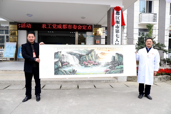 揭牌结束后,农工党大邑县支部主委钟大勇代表农工党成都市委会各基层组织为医院送上一幅国画《旭日东升》(作者:农工党崇州市支部党员王倩),憧憬医院美好的明天。