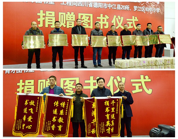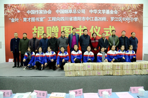 捐赠仪式上,“金叶·育才图书室”工程向罗江区、中江县的30所中小学校捐赠图书41199册,价值人民币1076985.80元。罗江区教育局、中江县教育局代表受赠学校接受中华文学基金会捐赠证书并向中国作家协会、中国烟草总公司赠送了锦旗,受赠学校接受了“金叶·育才图书室”授牌,受赠学校学生代表作了感谢发言。