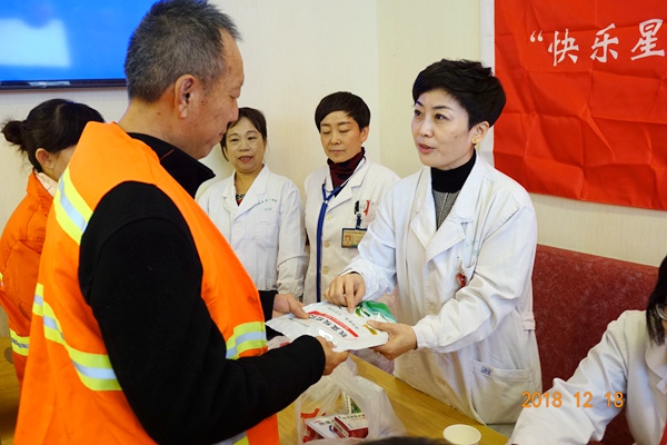 2018年12月18日,农工党石河子市委会组织部分党员,成立医疗志愿者服务队,携手“快乐星”爱心志愿者团队为石河子市环卫工人开展了“送医送药送温暖”冬至慰问活动。