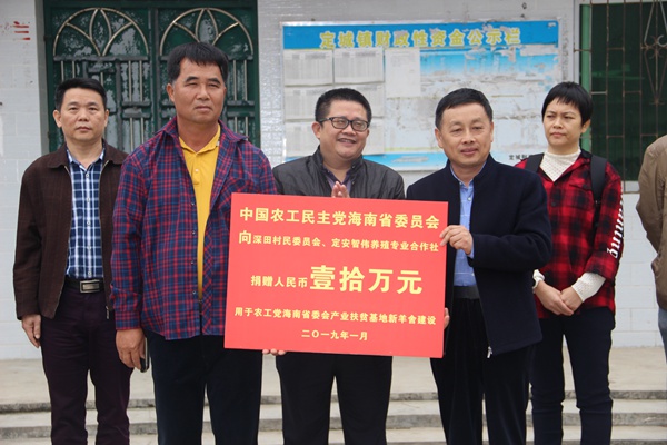 在捐赠仪式上,农工党海南省委会向深田村委会及定安智伟养殖专业合作社捐赠人民币十万元支持产业扶贫基地新羊舍建设。