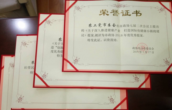 农工党舟山市委会《关于大力促进企业创新转型升级 提升企业竞争力 推进“创新舟山”建设的建议》、农工党市委会《关于深入推进健康产业 打造国际化健康小镇的建议》、沈聪《关于加强我市商品房质量管理的建议》荣获市政协2018年度优秀提案,黄迎春、沈聪、王淑芬、陶慧芳荣获市政协2018年度优秀委员称号,农工党界别活动组荣获2018年度先进界别活动组(委员工作室),农工党舟山市委会(二等奖)荣获2018年度反映社情民意信息工作先进单位,张永立、陶慧芳荣获先进个人荣誉称号。(农工党舟山市委会)