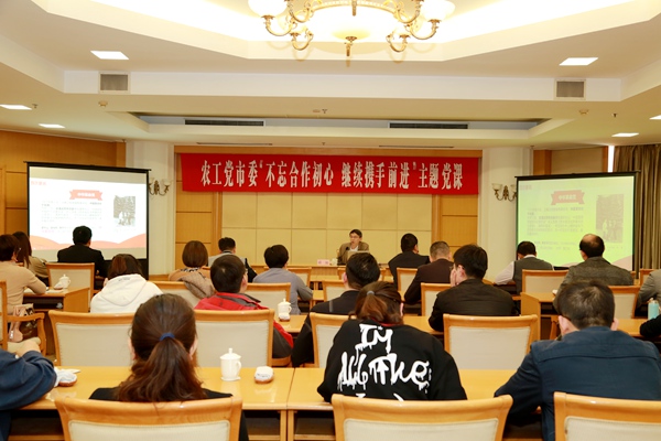 2019年4月12日下午,农工党张家港市委会在沙宾东4楼会议室举办“不忘合作初心,继续携手前进”主题党课。此次党课由市委会主委顾放主讲,市委会副主委兼办公室主任杜思梅主持。