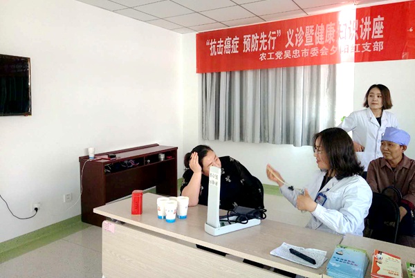 2019年4月18日,农工党吴忠市委会夕阳红支部在吴忠市人民医院肿瘤科活动室为40多名患者及家属开展了“抗击癌症、预防先行”义诊暨健康知识讲座活动。